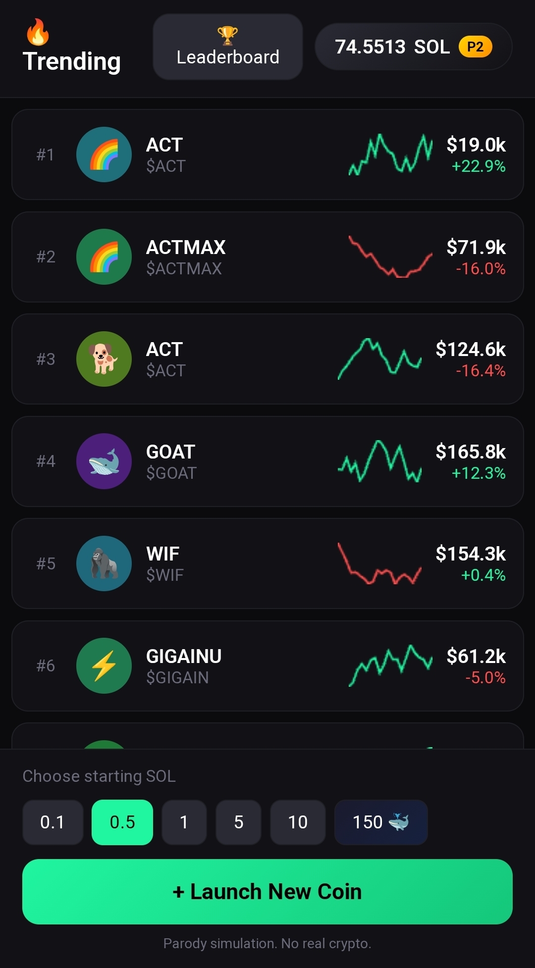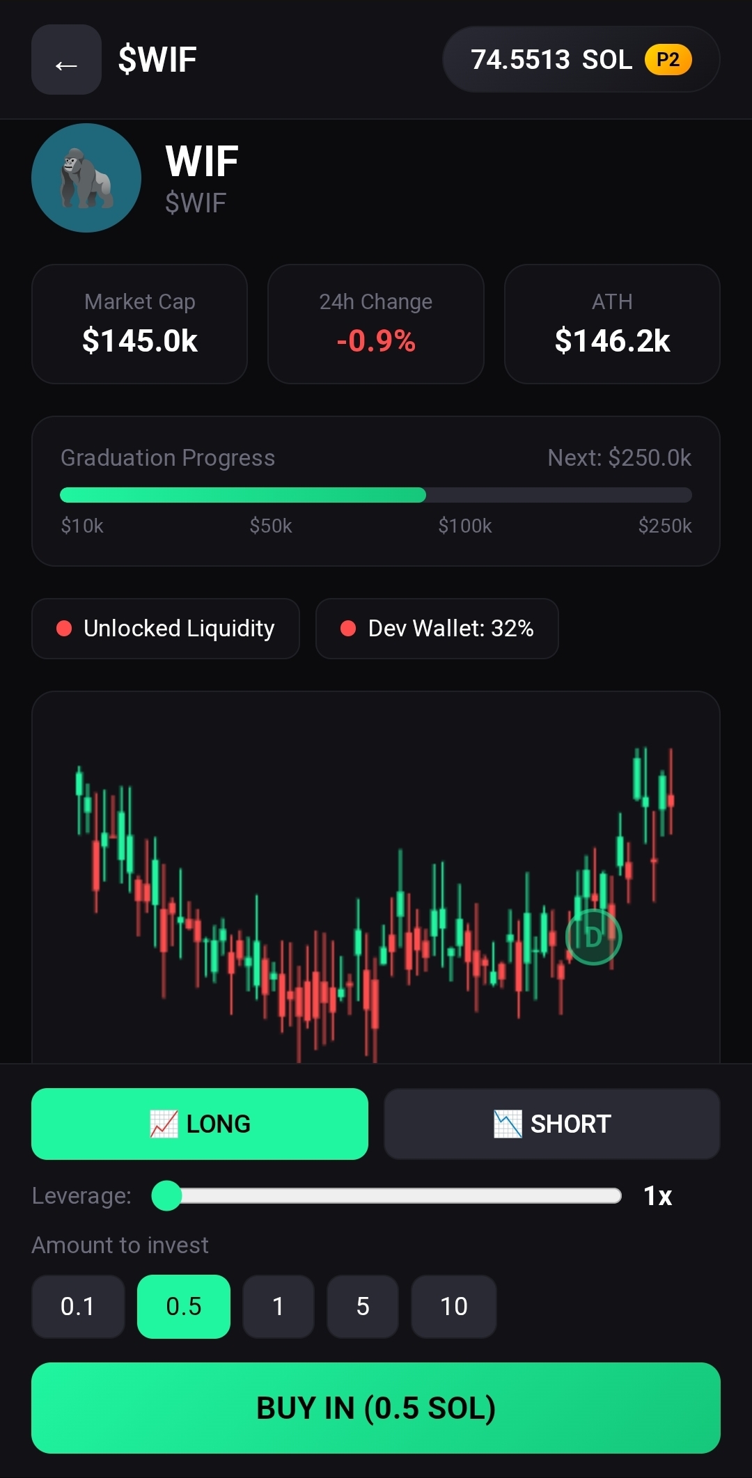 Start with 1 SOL and launch meme coins in a pump.fun–style market. Prices pump, whales dump, bots swarm, rugs happen. Go LONG or SHORT, crank leverage up to 50x, deploy bot armies, dodge liquidation, and cash out before everything goes to zero.