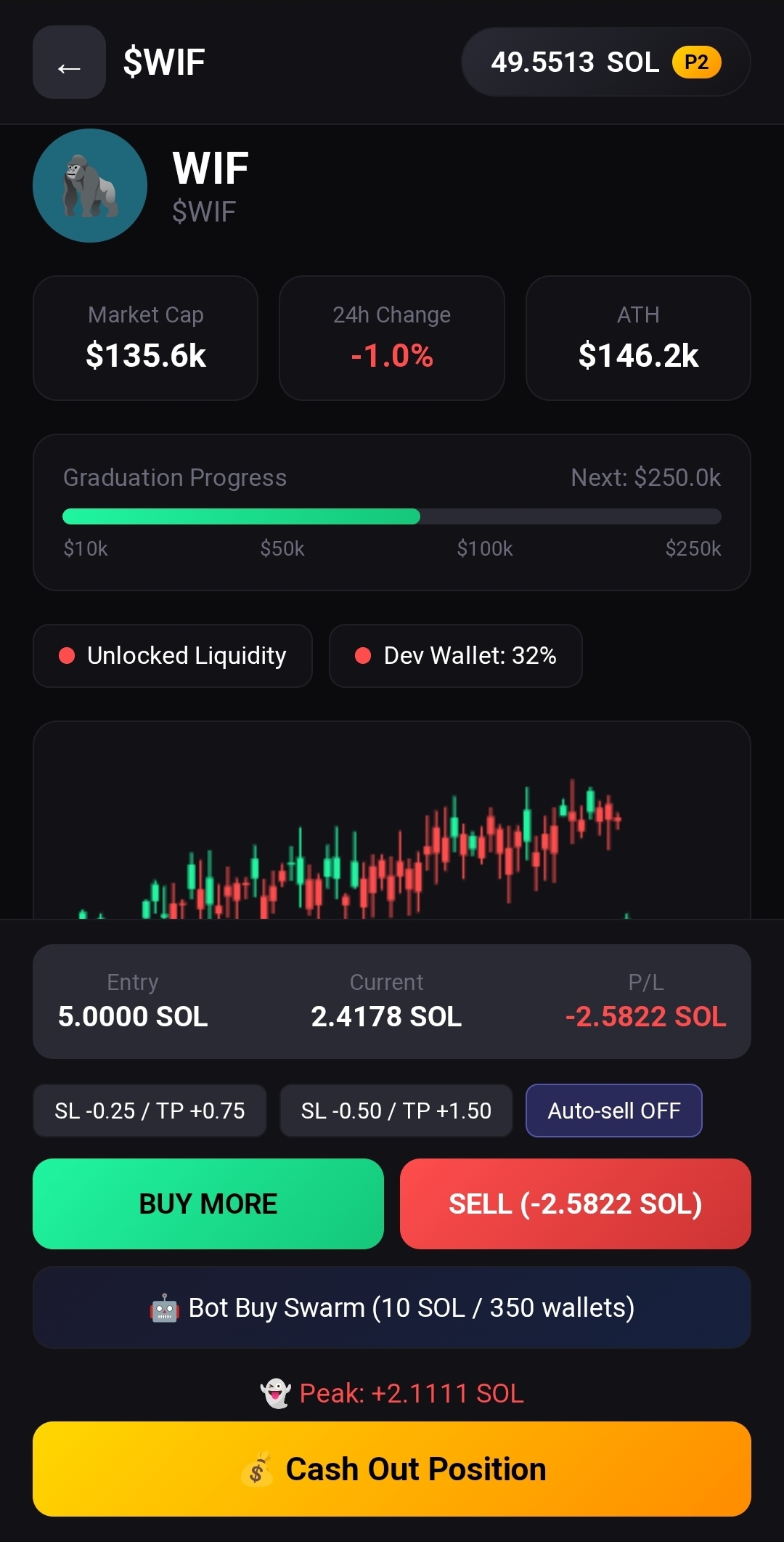 Every run affects your global wallet — profits stack, losses hurt. Hit 100 SOL to prestige and unlock permanent advantages. Share your gains with exchange-style PnL cards and climb the leaderboard.